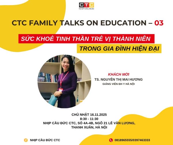 Trong buổi chia sẻ thứ 3 của chuỗi CTC Family Talks on Education, TS. Nguyễn Thị Mai Hương (Giảng viên ĐH Y Hà Nội) sẽ giúp các bậc cha mẹ hiểu rõ: