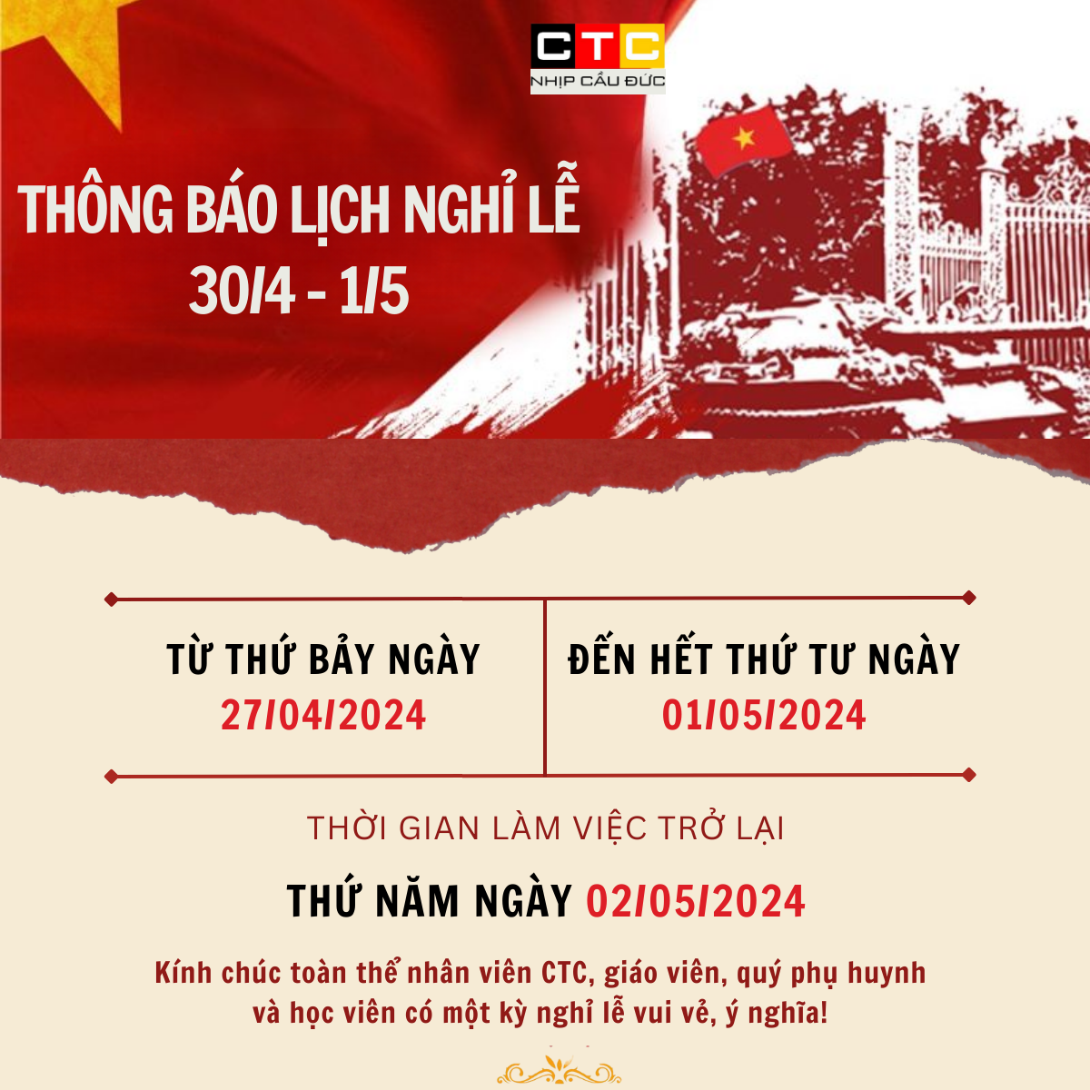 THÔNG BÁO LỊCH NGHỈ LỄ 30/4 và 1/5